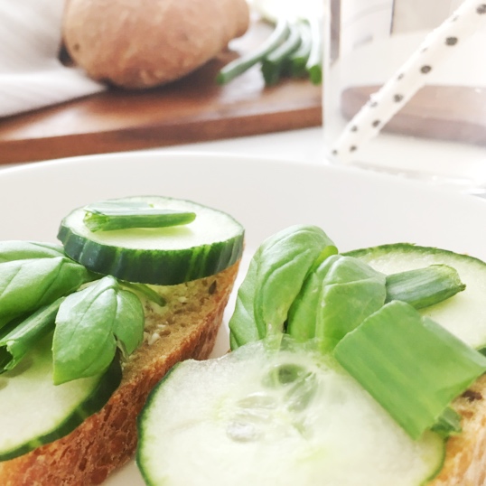 Tuore patonki, raikas kurkku, kevätsipulia, basilikaa ja hyvää seuraa. Ihanaa!